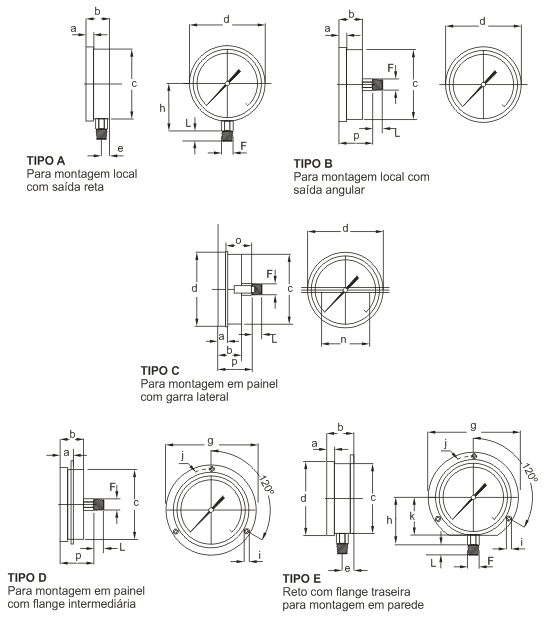 as dimensões para manômetros na tabela